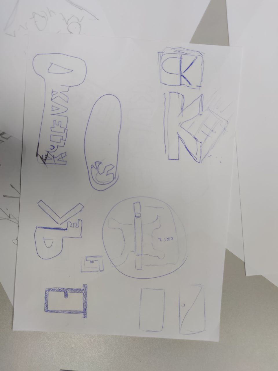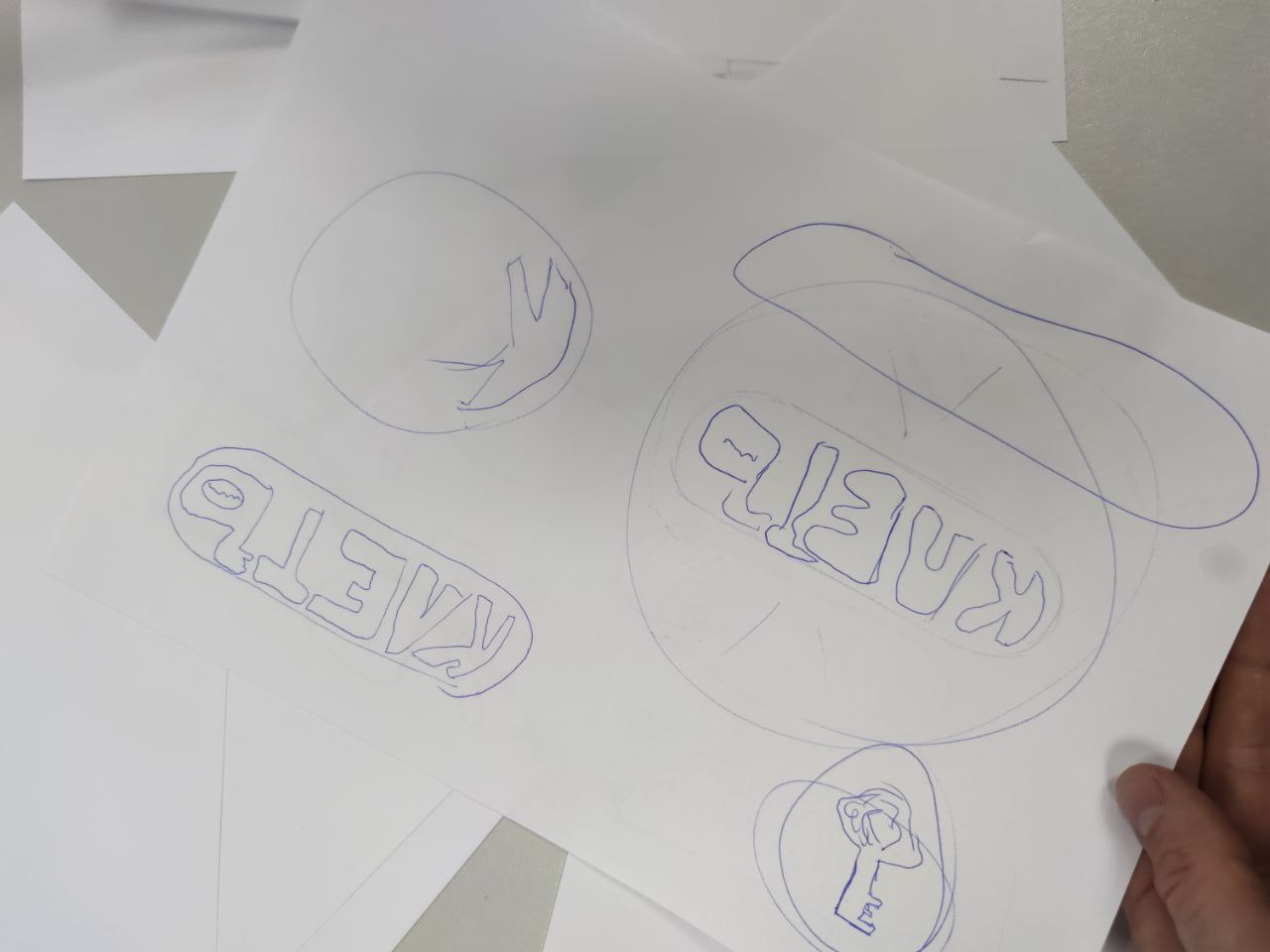 Мы сделали несколько первых эскизов вручную — карандашом на бумаге. На этом этапе прорабатывались разные формы ключа, композиции и варианты стилизации знака.